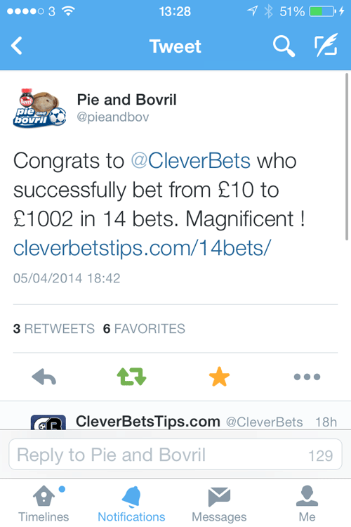 One of the things that sets Clever Bets apart from the rest is the Clever Bets £10 to £1000 14 bets challenge that we have now completed TWICE! Some doubted we could do it again, but we proved them wrong when we completed it for the second time on the 5th April 2014. We began the challenge on the 16th March 2014 and were able to complete it within 3 weeks. To see what the challenge consists of please scroll down.